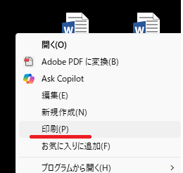 しかし印刷だけの操作であればいちいちファイルを開く必要はなくファイル→右クリック→ショートカットメニューから印刷を選択すれば印刷ができます。